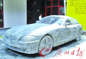 據(jù)介紹,該作品由現(xiàn)代藝術(shù)家戴耘歷時(shí)一年多創(chuàng)作完成。記者發(fā)現(xiàn),其輪胎、方向盤、排氣管,甚至連車標(biāo)都是用磚頭精心打磨而成。該創(chuàng)意園的工作人員介紹,這部車除了不能開之外,外形酷似寶馬車,價(jià)值達(dá)70多萬(wàn)元,其價(jià)位也堪比真寶馬。(鮑文娟)
