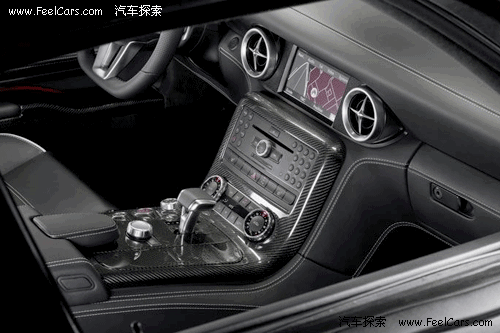 看到內(nèi)飾的第一感覺(jué)就是運(yùn)動(dòng)感很強(qiáng),無(wú)論是全黑色的真皮內(nèi)飾,還有鑲嵌點(diǎn)綴在各處的碳纖維面板,或者是三輻、平底的真皮方向盤,像瞄準(zhǔn)鏡一般的空調(diào)出風(fēng)口等等,都毫不客氣的顯露出了SLS以運(yùn)動(dòng)為本的設(shè)計(jì)理念,當(dāng)然,這也是在向前輩300SL致敬。