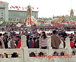 參加50年國慶游行的大型彩車擺放在天安門廣場上,十月二日數(shù)以萬計(jì)的游人從北京各處涌向這里,一睹節(jié)日廣場的風(fēng)采。