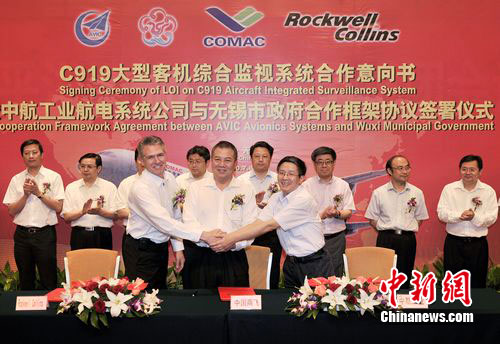 中新網(wǎng)無(wú)錫7月8日電(記者 孫權(quán))中國(guó)商用飛機(jī)有限責(zé)任公司、中航工業(yè)雷達(dá)與電子設(shè)備研究院和美國(guó)羅克韋爾柯林斯公司三方今日在無(wú)錫“握手”,確定國(guó)產(chǎn)C919大型客機(jī)綜合監(jiān)視系統(tǒng)的研制生產(chǎn)項(xiàng)目落戶(hù)無(wú)錫市濱湖區(qū)。幾年后,裝備“無(wú)錫造”綜合監(jiān)視系統(tǒng)的C919大型客機(jī),將翱翔在中國(guó)的藍(lán)天,并飛行在世界各地。