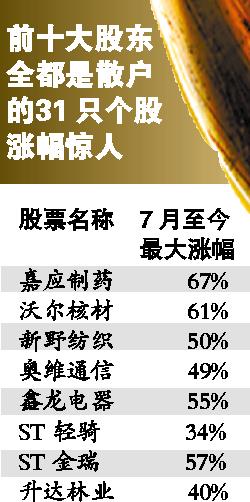 權(quán)威統(tǒng)計(jì)數(shù)據(jù)顯示,能夠在A股上市公司前十大流通股股東中“露臉”的個(gè)人投資者超過5000人。從中報(bào)來看,31只股票的前十大股東都是個(gè)人投資者,并且在7月份以來其整體表現(xiàn)十分出色,漲幅超過20%的就達(dá)22只。