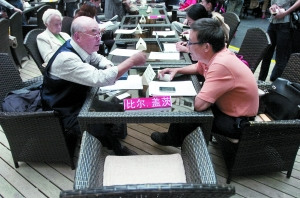 昨晚5時,民族園快捷假日酒店一層大廳,兩組長條餐桌擺放在現(xiàn)場的正中央!鞍头铺亍焙汀吧w茨”的名牌赫然擺放在兩排桌子的頭位,但位子一直空著。此前平民晚宴通過媒體向兩人發(fā)出邀請。其余座位都已坐滿,不斷有人簽到,只得在長桌的一側(cè)加座位。近100人參加平民晚宴,涉及公司白領(lǐng)、企業(yè)老板、大學(xué)生、公務(wù)員、醫(yī)生等各行業(yè)。