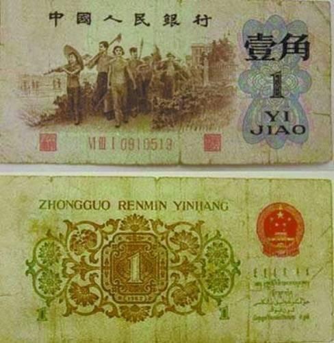 “背綠水印壹角于1962年印刷,其正面為深棕色,與普通的壹角票面無異,但背面卻有部分顏色為墨綠色,故集幣界稱之為‘背綠壹角’!奔瘞艑<冶硎,由于印刷時(shí)采用的鈔票紙不同,“背綠壹角”有帶五星水印和無水印兩種版式,其中帶五星水印的“背綠壹角”存世量十分稀少。有媒體報(bào)道,在2000年以前,背綠水印壹角從未發(fā)現(xiàn)過贗品。近年來,由于升值很快,造假者采用各種高科技手段進(jìn)行偽造,市面上逐步出現(xiàn)了贗品。