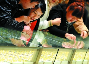 售貨員告訴記者現(xiàn)在賣得最好的黃金品種就是金條,由于賣場的銷售價格比國際金價有個滯后期,所以現(xiàn)在總有人急著出手,趕在下次漲價之前“藏”金條,而且現(xiàn)在出手越來越大,100克的金條成為“藏金族”的最愛。
