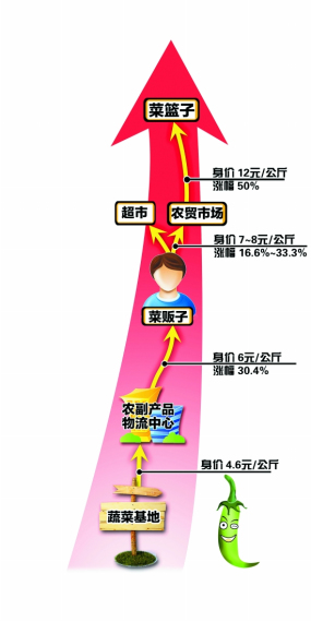 新華社“新華視點(diǎn)”記者日前調(diào)查發(fā)現(xiàn):目前蔬菜生產(chǎn)和流通環(huán)節(jié)出現(xiàn)一些怪現(xiàn)象,從批發(fā)市場到城內(nèi)的零售市場,蔬菜加價(jià)往往超過50%,其中少數(shù)菜品價(jià)格甚至翻倍。