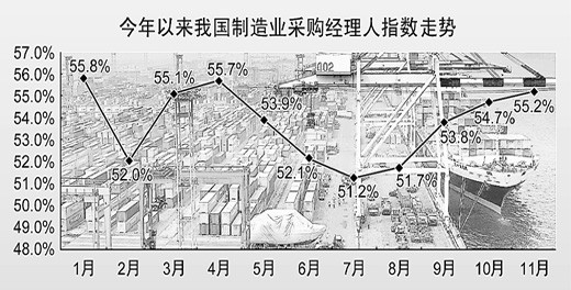 中國物流與采購聯(lián)合會1日發(fā)布數(shù)據(jù),11月中國制造業(yè)采購經(jīng)理指數(shù)PMI為55.2%,創(chuàng)近7個月來新高,環(huán)比上升0.5個百分點。自8月份以來,PMI指數(shù)連續(xù)4個月回升。