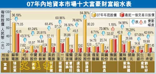 中新網(wǎng)7月28日電 據(jù)香港《文匯報》報道,中國內(nèi)地有媒體27日公布“2007資本市場富豪榜”,以07年A股市場最后一個交易日收市值計算,蘇寧電器大股東張近東等10大資本家榜上有名。受惠于2007年內(nèi)地股票市場爆發(fā)式增長,該榜單前十大富豪的財富最低門坎已升高至100億元,而2006年邁入前十俱樂部則只需要30億元。不過,僅僅半年,其中大部分人便“風光不再”。隨著內(nèi)地股市半年來的一路慘跌,他們的身家亦大幅縮水。據(jù)統(tǒng)計,在榜單的前10名富豪中,所持有的股票下跌幅度最高竟達八成。