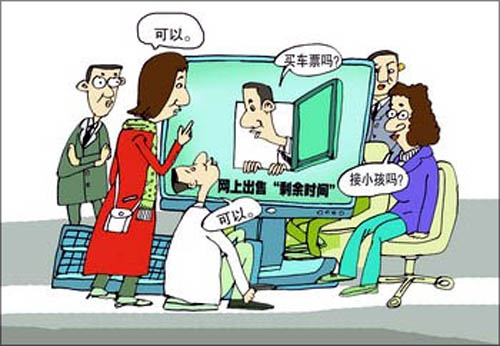 在搜索引擎百度上輸入“出售剩余時(shí)間”,可得到相關(guān)網(wǎng)頁(yè)400多萬(wàn)篇,“出售時(shí)間”生意的火爆可見(jiàn)一斑!澳阆敫墒裁次襾(lái)幫你完成,給你節(jié)約時(shí)間,用我的時(shí)間來(lái)給你辦事,然后你支付一定的費(fèi)用,這就是‘出售剩余時(shí)間’!本W(wǎng)友劉女士在廣告上如此解釋“出售剩余時(shí)間”。