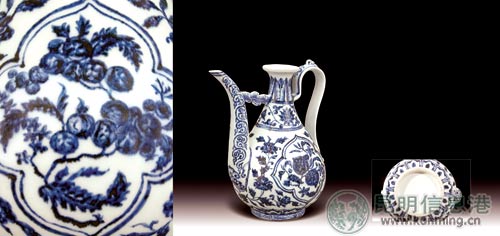 據(jù)云南典藏有關(guān)負(fù)責(zé)人介紹,拍賣“標(biāo)王”青花開光折枝花果紋執(zhí)壺通體施以白釉,釉質(zhì)青白透澈,肥潤(rùn)晶瑩,青花發(fā)色翠藍(lán)深沉,局部有鐵銹斑,圖案為上等“蘇麻離青”鈷料所繪。從文物藝術(shù)品的收藏價(jià)值來看,執(zhí)壺整器端莊大氣,做工精湛,屬于明代永樂時(shí)期青花瓷中的代表之作。目前,除國(guó)內(nèi)外的文物館藏之外,同類器物能在國(guó)內(nèi)外市場(chǎng)上流通的可謂屈指可數(shù),很少見諸于市,因此也就更加彌足珍貴了。