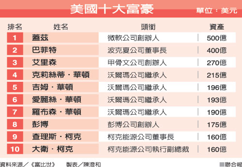 據(jù)《福布斯》2009年美國400大富豪排行榜,美國首富依然是軟件巨擘微軟公司創(chuàng)辦人蓋茨,是連續(xù)第16年拿下冠軍,不過他的資產(chǎn)比去年減少70億美元至500億美元。