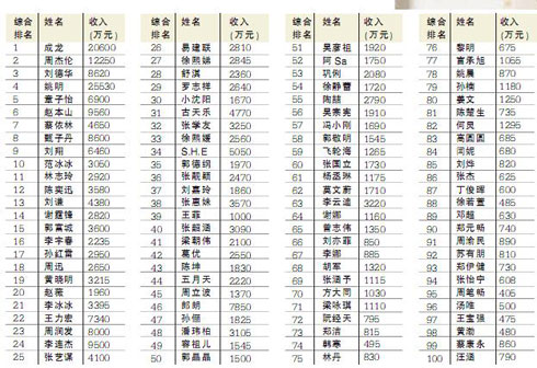 收入和曝光率兩項依然是福布斯中國名人榜量化衡量明星價值的重要指標。收入不僅體現(xiàn)了明星身價和過去一年內(nèi)的活躍程度,還折射出各自行業(yè)的發(fā)展境況。而他們在網(wǎng)絡、報紙、雜志和電視節(jié)目中的曝光則是聲望的晴雨表。