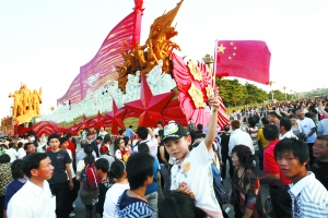 “黃金周”期間,天安門廣場人流如織,中外游客超過820萬人次,超過2008年國慶黃金周北京接待的游客總人數(shù)。北京市旅游局統(tǒng)計,北京203個主要景點接待游客的總量突破了950萬人次。