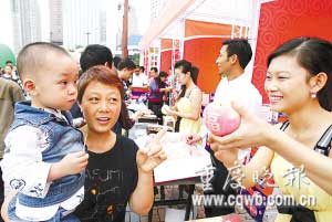 昨天的朝天門廣場,微風(fēng)伴著細(xì)雨,氣溫適宜,不少市民前來玩耍。廣場中央,是一個(gè)用蘋果搭成的展覽塔,廣場一側(cè),是昭通市政府的蘋果展銷臺(tái),堆積如山的蘋果吸引了廣大重慶市民,負(fù)責(zé)推銷的工作人員不停地給蘋果削皮,削好的蘋果很快就被市民吃了個(gè)精光。