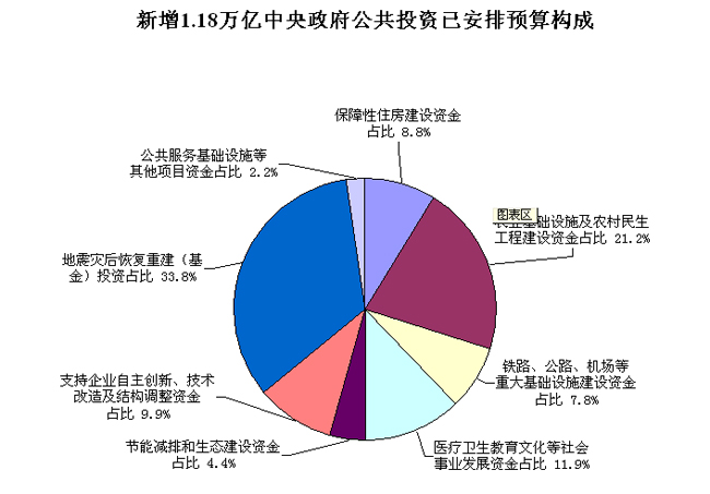 截至目前,1.18萬億元新增中央政府公共投資已安排資金5915億元,分項(xiàng)目情況如下:用于保障性住房建設(shè)資金522億元,占8.8%;農(nóng)業(yè)基礎(chǔ)設(shè)施及農(nóng)村民生工程建設(shè)資金1253億元,占21.2%;鐵路、公路、機(jī)場(chǎng)等重大基礎(chǔ)設(shè)施建設(shè)資金460億元,占7.8%;醫(yī)療衛(wèi)生教育文化等社會(huì)事業(yè)發(fā)展資金703億元,占11.9%;節(jié)能減排和生態(tài)建設(shè)資金260億元,占4.4%;支持企業(yè)自主創(chuàng)新、技術(shù)改造及結(jié)構(gòu)調(diào)整資金585億元,占9.9%;地震災(zāi)后恢復(fù)重建(基金)投資2000億元,占33.8%;公共服務(wù)基礎(chǔ)設(shè)施等其他項(xiàng)目資金132億元,占2.2%。