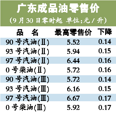 國家發(fā)改委決定從今天零時起降低成品油價,汽、柴油每噸降低190元。昨日,廣東省物價局公布了新的成品油最高銷售價格。國Ⅱ標(biāo)準(zhǔn)90號汽油每升下調(diào)0.14元,93號汽油每升下調(diào)0.15元,97號汽油每升下調(diào)0.16元,0號柴油每升下調(diào)0.16元;國Ⅲ標(biāo)準(zhǔn)90號汽油每升下調(diào)0.14元,93號汽油每升下調(diào)0.15元,97號汽油每升下調(diào)0.17元,0號柴油每升下調(diào)0.17元。(記者葉平生 通訊員岳佳綜)