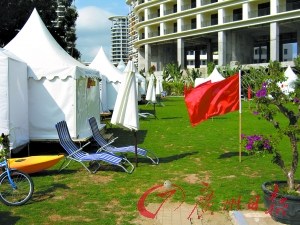 高端酒店咬定高價(jià)不放松,中低端酒店在亦步亦趨的同時(shí)還不忘廣開(kāi)財(cái)源。在三亞灣,有酒店就推出體驗(yàn)式帳篷,期待招徠客源。記者在三亞度假村酒店看到,這家酒店的草坪上,15頂白色帳篷已經(jīng)搭起,里面不僅配備了床,水電也一應(yīng)俱全,每個(gè)帳篷內(nèi)還配備了環(huán)保廁所。