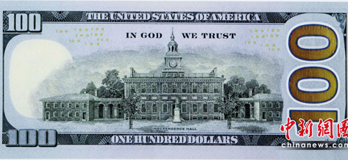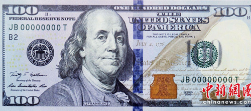 美國財政部公布了新版100元美鈔的照片,鈔票上同樣仍是美國開國元老之一的富蘭克林(Benjamin Franklin)肖像,但鈔票正中央多了一道藍色的3D立體安全圖樣,隨著角度不同,可以變換鐘或數(shù)字100的圖型。