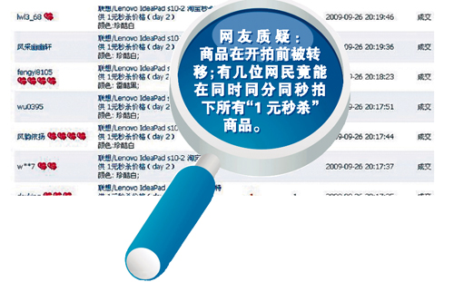 淘寶的安民公告,仍然為部分網(wǎng)友所不能接受。天涯網(wǎng)友“秋風(fēng)月無(wú)痕”認(rèn)為,淘寶沒(méi)出面解釋何以有三人能在同一分同一秒同時(shí)秒下三件商品!皟(nèi)有種種怪異之事,不得不讓人想到這是一場(chǎng)欺騙廣大中國(guó)人民的炒作行為。如果淘寶不能給出合理的讓人信服的解釋?zhuān)敲醋罱K受害的不單單是廣大受騙的群眾,更是淘寶網(wǎng)! “秋風(fēng)月無(wú)痕”及幾名網(wǎng)友隨后在跟帖中貼出當(dāng)晚截圖,聲稱(chēng)既然當(dāng)晚人太多,“不能正常瀏覽頁(yè)面”,而實(shí)際上商品已經(jīng)在20時(shí)03分之前下架,但網(wǎng)友卻截圖發(fā)現(xiàn)有多條20時(shí)17分到20時(shí)19分的記錄,“淘寶怎么解釋這幾條記錄,03分到17分之間是空的,但是17分到19分之間突然冒出幾條記錄,這能讓人不懷疑是做了手腳嗎?”
