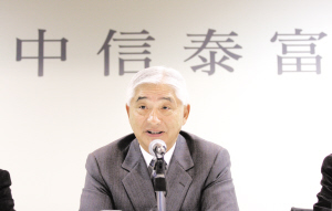 中信泰富有限公司25日公布,由于外匯合同所導(dǎo)致的變現(xiàn)及市場公允值的稅后虧損對公司溢利造成嚴(yán)重影響,中信泰富去年稅后股東應(yīng)占凈虧損為126.62億港元。董事會建議不派發(fā)末期股息,因此全年每股派息為中期股息的0.3港元。另外不派給董事們2008年全年的花紅。圖為榮智健在業(yè)績發(fā)布會上。