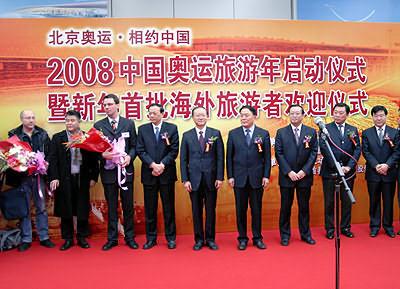 中新網1月2日電 據國家旅游局網站消息,2008年元月一日上午10:50分,CA932航班平穩(wěn)地降落在北京首都國際機場。飛機艙門打開時,德國伊卡魯斯旅行社副總裁萊爾夫·琥珀先生接到了來自北京市旅游局工作人員送上的鮮花。他所率領的德國234名游客成為2008年北京入境的第一批旅游者。這標志著2008年中國奧運旅游年正式啟動。