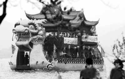 其實(shí),早在1986年,樓外樓飯店就推出了一艘餐飲船,一直?吭跇峭鈽情T前的碼頭。據(jù)樓外樓副總經(jīng)理蔣紅介紹,飯店去年投資近600萬(wàn)元又推出了一艘“樓外樓號(hào)”畫舫,船體金碧輝煌,可供50人游湖、20人用餐。
