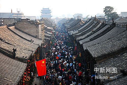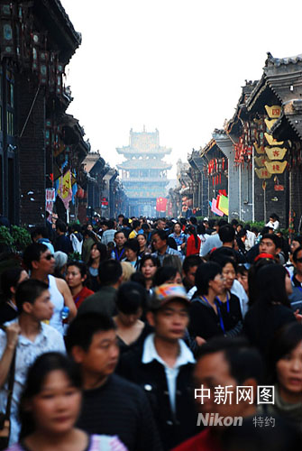 國慶期間,人潮涌動(dòng)的平遙古城南大街。 裴旭亮 攝