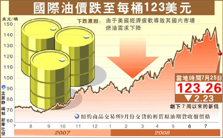 勇闖150美元/桶關(guān)口未果,國(guó)際原油價(jià)格連日來(lái)大幅下挫。上周最后一個(gè)交易日(7月25日),紐約商品交易所原油期貨價(jià)格跌至每桶123美元水平,創(chuàng)下7周以來(lái)新低。與本月11日創(chuàng)下的每桶147.27美元的盤(pán)中歷史最高紀(jì)錄相比,紐約商品交易所原油期貨價(jià)格在半個(gè)月內(nèi)已累計(jì)下跌超過(guò)24美元。