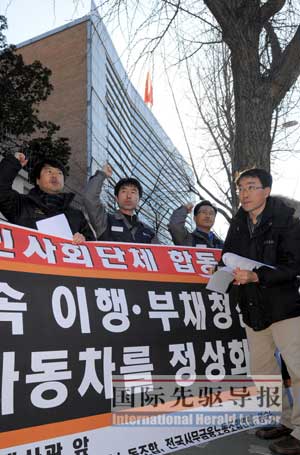 1月13日上午,中國駐韓大使館門前的寧靜被打破:30多名韓國雙龍汽車工會成員高舉橫幅標(biāo)語,向早已等候在現(xiàn)場的媒體記者宣讀了一份聲明,要求中韓兩國政府采取救助措施,查處所謂的上汽“技術(shù)轉(zhuǎn)移”問題。抗議活動進(jìn)行了一個多小時。