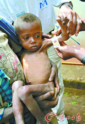 圖:埃塞俄比亞一營養(yǎng)不良的兒童在接受醫(yī)療人員的診治