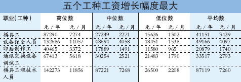 工資增長幅度最大的5個(gè)工種分別是模具工,增長了56.53%,年平均工資達(dá)到了41151元;設(shè)備保全人員,增長了48.64%,年平均工資達(dá)到了49166元;印后制作工,增長了47.04%,年平均工資達(dá)到了20879元;通訊交換設(shè)備調(diào)試工,增長了42.31%,年平均工資為33517元;模具工程技術(shù)人員,增長了41.86%,年平均工資高達(dá)87119元。(具體工資情況可見表格)