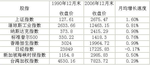 表1 1990年12月末~2006年12月末主要股指平均月增長(zhǎng)率