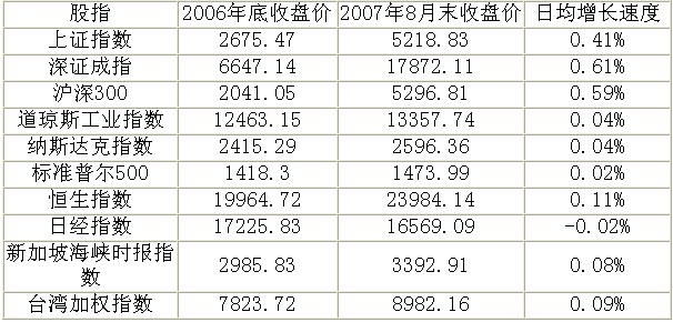 表2 中國(guó)股市暴漲期內(nèi)與主要股指日均增長(zhǎng)速度比較(2006.12.31~2007.8.31)