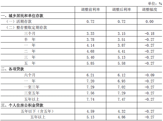 金融機構(gòu)人民幣存貸款基準(zhǔn)利率調(diào)整表