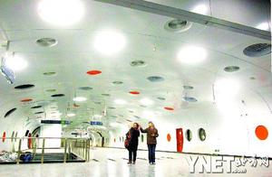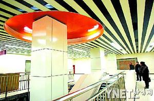 “太空艙”———這是記者對(duì)“金臺(tái)夕照”站廳裝修的直接印象。寬闊站廳內(nèi),兩側(cè)墻壁如括號(hào)般向內(nèi)彎曲形成類似機(jī)艙的形狀。除了地面之外,無(wú)論墻壁還是天花板,圓形白光燈池和橘紅色色塊如密集的氣泡一樣分布,大的直徑可達(dá)1米,小的直徑才20厘米左右。面對(duì)如此現(xiàn)代風(fēng)格的設(shè)計(jì),“金臺(tái)夕照”仿佛被賦予了新的生命。
