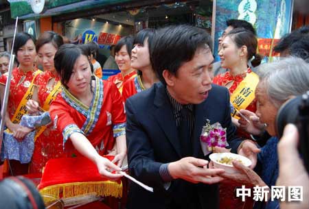中新網(wǎng)廣州4月7日電 (記者 莫非 通訊員 林月明)大方漆器、布依地毯、蠟染、玉屏簫笛等讓人眼花繚亂,貴陽(yáng)的氣息撲面而來(lái)。廣東首家“貴陽(yáng)形象店”7日在南湖國(guó)旅·西部假期位于廣州上下九步行街的營(yíng)業(yè)點(diǎn)落戶(hù)。在開(kāi)業(yè)現(xiàn)場(chǎng),貴陽(yáng)旅游局副局長(zhǎng)方隨洪更是走上街頭,請(qǐng)老廣品嘗正宗美味的酸湯魚(yú),同時(shí)還將香囊等貴陽(yáng)的小特產(chǎn)親手贈(zèng)送給市民,邀請(qǐng)老廣齊赴貴陽(yáng)旅游。