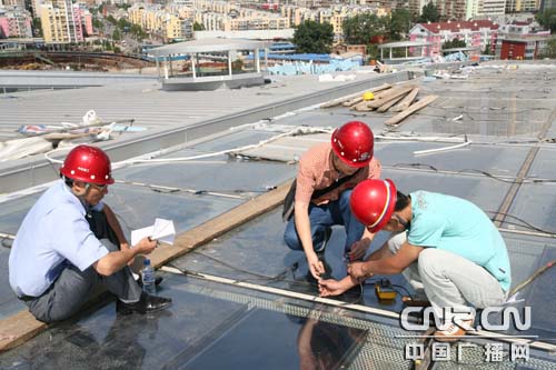 中鐵建工集團(tuán)技術(shù)人員正在對(duì)北京南站太陽(yáng)能光伏電池板進(jìn)行單體測(cè)試