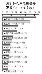 本次民調(diào)發(fā)現(xiàn),如今公眾對“食品”和“醫(yī)藥”的質(zhì)量最不放心,分別有72.3%和59.3%的人選擇此項。接下來依次是:餐飲(33.0%)、電子產(chǎn)品(32.1%)、服飾化妝(22.7%)、房地產(chǎn)(20.0%)、教育培訓(xùn)(17.2%)、家電(16.0%)、金融服務(wù)(14.4%)、電信通信(13.7%)、旅行(12.6%)、車輛(11.9%)。