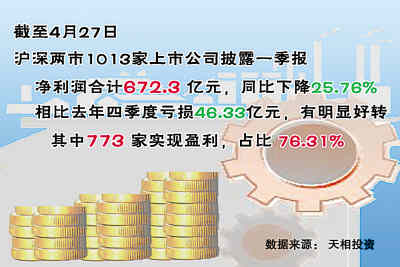 據(jù)天相投資顧問公司的統(tǒng)計,截至4月27日,滬深兩市共1421家上市公司披露了年報。其中,1238家公司去年實現(xiàn)盈利,占比87.12%。已披露年報公司去年凈利潤合計7666億元,較上年同期下降15.88%。