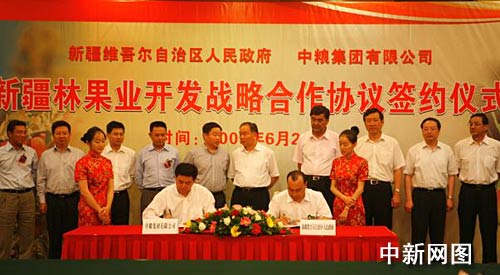 中新網(wǎng)烏魯木齊6月24日電 (記者 汪金生) 新疆維吾爾自治區(qū)政府24日與中糧集團(tuán)簽署《新疆林果業(yè)開(kāi)發(fā)戰(zhàn)略合作協(xié)議》,這次簽約是中糧集團(tuán)與新疆在番茄、制糖、油脂、飲料等業(yè)務(wù)開(kāi)展合作基礎(chǔ)上的又一項(xiàng)重要合作,拉開(kāi)了中糧集團(tuán)全面進(jìn)軍新疆林果業(yè)開(kāi)發(fā)的序幕,奠定了新疆林果業(yè)產(chǎn)業(yè)升級(jí)、做大做強(qiáng)的基礎(chǔ)。