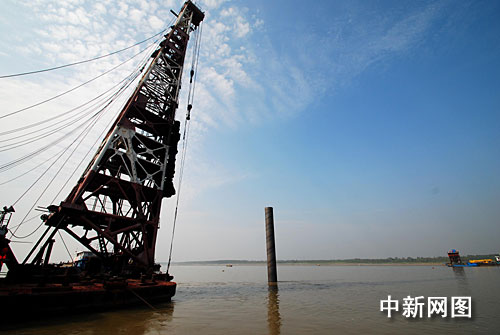 中新網(wǎng)九江10月15日電(胡國林)10月15日,施工人員在九江新長江大橋所在的江面上用打樁船打下第一根鋼管樁,九江新長江大橋第一根鋼管樁在江面成功豎立。