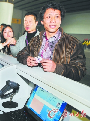 來自湖南邵陽、在中山橫欖鎮(zhèn)某建筑工地做泥水工的唐結(jié)元成了今年春運(yùn)廣州實(shí)名制火車票查驗(yàn)進(jìn)站的第一人。昨天下午2時(shí)不到,他扛著行李來到琶洲展館候乘點(diǎn)驗(yàn)證臺前。工作人員先將機(jī)票二維碼放在掃描器處掃了一下,電腦屏幕顯出L7688次車票的信息,還有唐結(jié)元的姓名和身份證號碼。接著她又將唐結(jié)元的身份證放在閱讀器上,電腦屏幕又顯示出唐結(jié)元的個(gè)人信息。接著,屏幕顯示“通過”字樣。工作人員隨即在車票上蓋上“廣鐵集團(tuán)廣州火車站實(shí)名驗(yàn)訖”的章。整個(gè)過程不超過20秒。據(jù)悉,對于一代證和其他十幾種的購票證件都需要人工驗(yàn)票。