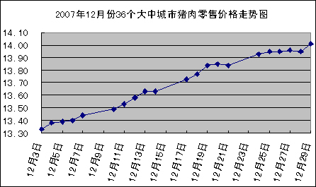 中新網(wǎng)1月2日電 國家發(fā)改委網(wǎng)站發(fā)布消息稱,據(jù)國家發(fā)展改革委價(jià)格監(jiān)測中心監(jiān)測,元旦前一周(2007.12.24-2007.12.29,下同)全國36個(gè)大中城市豬肉(精瘦肉)集市平均零售價(jià)格每500克為13.96元,比上期(2007.12.17-2007.12.21,下同)上漲1.09%。
