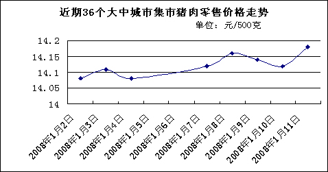 中新網(wǎng)1月14日電 國家發(fā)改委網(wǎng)站消息稱,據(jù)國家發(fā)展改革委價格監(jiān)測中心監(jiān)測,上周(2008.1.7-2008.1.11,下同)全國36個大中城市集市豬肉(精瘦肉)平均零售價格每500克為14.14元,比前一周(2007.12.31-2008.1.4,下同)上漲0.35%。