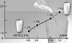 從下月開始,上海家庭訂奶戶每天要多花4毛錢,光明送貨上門的奶制品下月價格普漲,瓶裝奶、杯裝奶價格上調(diào)0.4元~0.5元,這是繼去年11月以后,入戶奶的再一次提價。去年11月開始,光明乳業(yè)對上海地區(qū)的部分入戶奶價格進行了調(diào)整,每瓶上調(diào)0.1~0.3元,平均上調(diào)幅度為1.8%,價格調(diào)整涉及入戶奶全部品種的30%左右。
