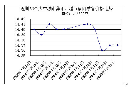 中新網(wǎng)7月28日電 國家發(fā)改委網(wǎng)站消息,據(jù)國家發(fā)展改革委價格監(jiān)測中心監(jiān)測,上周(2008.7.21-2008.7.25,下同)全國36個大中城市集市、超市豬肉(精瘦肉)平均零售價格每500克為14.38元,與前一周(2008.7.14-2008.7.18,下同)相比下降0.13%。