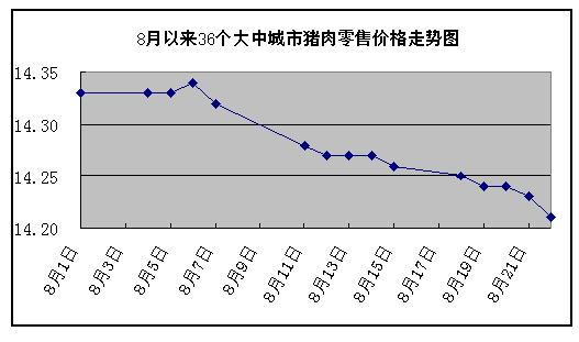 中新網(wǎng)8月25日電 國(guó)家發(fā)改委網(wǎng)站消息,據(jù)國(guó)家發(fā)改委價(jià)格監(jiān)測(cè)中心監(jiān)測(cè),上周(8月18日~8月22日)全國(guó)36個(gè)大中城市集市、超市豬肉(精瘦肉)平均零售價(jià)格每500克為14.23元,與前一周(8月11日~8月15日,下同)相比下降0.28%。