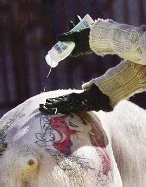在位于豬圈隔壁的工作室,記者看到了工人為名叫“美人魚(yú)”的豬文身的過(guò)程。