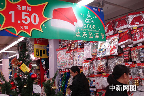 “像這個(gè)一米多高的圣誕樹,去年要賣一百左右,現(xiàn)在搞優(yōu)惠促銷,五十塊錢都不到!焙贾菔醒影猜纺成痰甑墓ぷ魅藛T說,商店借節(jié)造勢,商品往往熱銷,但今年由于遭遇金融危機(jī),商家只好搞促銷,并紛紛推出優(yōu)惠折扣來刺激消費(fèi)。