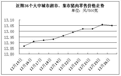中新網(wǎng)12月30日電 據(jù)國家發(fā)改委網(wǎng)站消息,據(jù)國家發(fā)展改革委價(jià)格監(jiān)測中心監(jiān)測,上周(12月22日-12月26日)36個(gè)大中城市超市、集市豬肉(精瘦肉)平均零售價(jià)格每500克為13.03元,比前一周(12月15日-12月19日,下同)上漲0.85%。