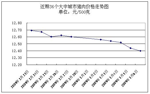 中新網(wǎng)3月9日電 據(jù)國家發(fā)改委網(wǎng)站消息,據(jù)國家發(fā)展改革委價格監(jiān)測中心監(jiān)測,上周(2009.3.2-2009.3.6,下同)全國36個大中城市集市、超市豬肉(精瘦肉)平均零售價格每500克為12.49元,與前一周(2009.2.23-2009.2.27,下同)相比下降1.19%。